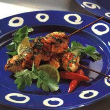 5.将烤鸡串排放在加过热的上菜盘里,浇上酱汁,用辣椒、橘瓣形莱姆块和香菜点缀后上桌。