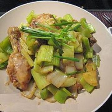 3.快火倒油起锅,爆香蒜蓉、香茅、红葱头、洋葱炒软,加回鸡块,西芹,加汁料炒匀即成。