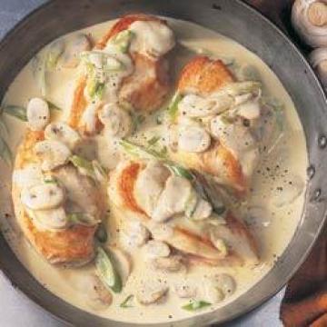 橄榄油1汤匙,黄油25克,去骨去皮鸡脯4块,每块约175克,盐、黑胡椒适量,大葱4根,蘑菇350克,面粉1汤匙,清鸡汤150毫升,一次分离稀奶油150毫升