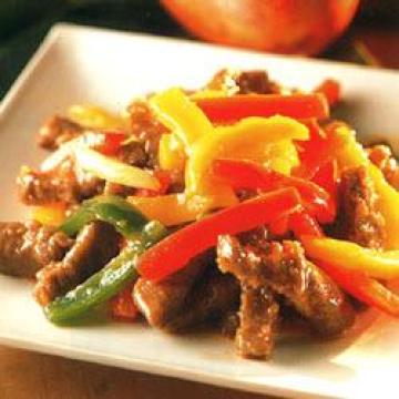 3.倒出锅内剩余的油,只留下少许,爆香葱和大蒜。加入牛肉快炒,随后加入青、红甜椒及所有调味料,一起烹调。