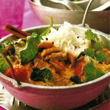 葵花籽油1汤匙,大洋1个葱,切薄片,白蘑菇(洋菇)150克,切片,沙朗牛排(西冷牛排)400克,去脂后切丝,罐装油渍碎姜11/2茶匙,沥干,大蒜2瓣,拍碎,干辣椒片1/2茶匙,磨碎的香菜籽(胡荽籽、芫荽籽)2茶匙,小豆蔻粉(groundcardamom)1/4茶匙,姜黄(turmeric)1/4茶匙,(肉)豆蔻粉(gratednutmeg)1/4茶匙,切碎的西红柿1罐(约400克),太白粉(粟粉)1茶匙,混合1汤匙水,原味全脂优格(酸奶酪、酸奶)300克,蜂蜜1汤匙,嫩菠菜叶125克,莱姆(青柠)1/2个,榨汁,切碎的香菜(芫荽)2汤匙,及装饰用的香菜叶,豆蔻饭:,印度香米340克,淘洗干净,肉桂棒(cinnamonstick)1根绿色小豆蔻荚(greencardamompod)8个,压碎外壳,柠檬1/2个,榨汁,盐1/4茶匙