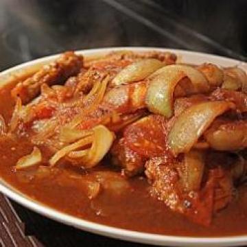 2.快火下油(约1汤匙)起锅,加入洋葱和1茶匙盐,1汤匙老抽炒软,再加入蕃茄和1汤匙糖炒软,加入汁料炒匀煮开,加入猪排,盖盖焖2分钟,调味,勾芡,装盘即成。