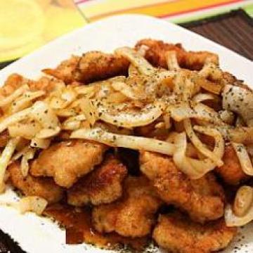 2.中火下油(约半杯)起锅,猪排先炸至微黄盛起,再转大火,将猪排回锅炸第二次至金黄盛于盘中,倒剩少许油,下洋葱和1/3茶匙盐炒软,再到入汁料煮开,淋于猪排上即成。