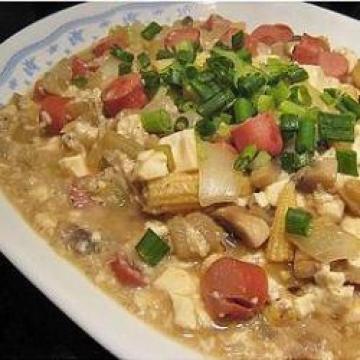 1.快火下油起锅,炒香蒜蓉,加入洋葱加少许盐炒软,加入香肠炒至全熟,再加玉米笋、磨菇、少许胡椒粉略炒,最后加入豆腐块。