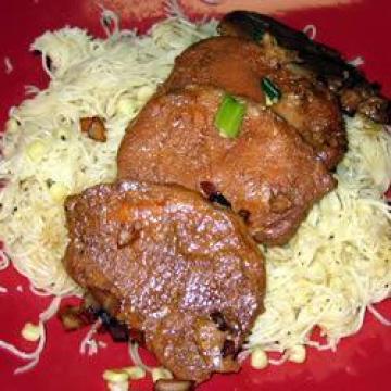 植物油30毫升,猪里脊肉6块,去骨,蜂蜜45毫升,水100毫升,酱油60毫升,小洋葱1个,切碎,细生姜末1克,新鲜黑胡椒粉0.5克