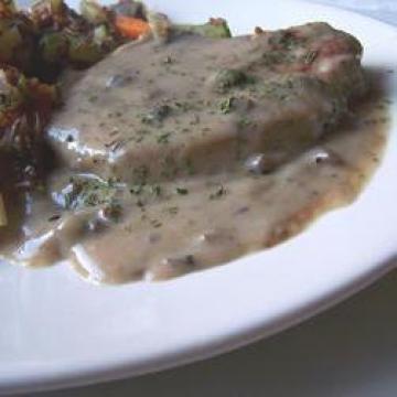 猪排4块,盐和胡椒粉 适量,大蒜1瓣,压碎,洋葱1个,切碎,新鲜蘑菇225克,切片,浓缩奶油蘑菇汤1罐