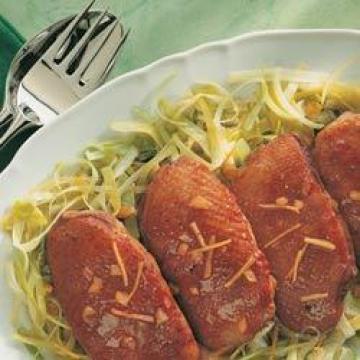 7.韭葱盛入餐盘,覆上鸭肉,最后浇上姜味酱汁。