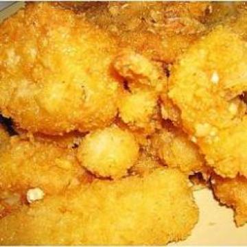 咸蛋2只(只用蛋黄),巨型扇贝肉4只(或中型8只),中虾12只(或大虾6只),鱿鱼筒1条(不要买成墨鱼,没有须的那种),蒜蓉3汤匙,炸油和牛油适量,炸浆:,生粉、蛋浆、面包糠少许