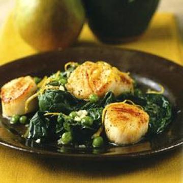 新鲜菠菜340克,橄榄油2汤匙,新鲜干贝(带子)680克,大蒜2瓣,切末,柠檬皮丝1茶匙,低钠零脂肪鸡汤240毫升,冷冻豌豆(青豆)450克,解冻,现榨柠檬汁1汤匙,盐1/4茶匙,黑胡椒粉1/4茶匙