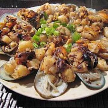 主材:,冻贻贝14只,解冻去壳,中个冻扇贝6只,解冻切碎,中个熟虾6只,解冻切碎,芋丝1包(14粒),青葱1条,切碎,汁料:份量只作参考,蒜蓉豆豉酱1+1/2汤匙,糖2茶匙,蒜蓉2汤匙,白胡椒、盐少许,麻油2茶匙
