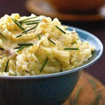 4.沥干马铃薯,放入大碗,加入牛奶和大蒜。将马铃薯捣成泥,然后拌入韭葱、甘蓝菜、肉豆蔻粉、盐、胡椒粉和奶油。撒上细香葱即可。