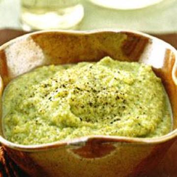 2.将蔬菜和120毫升煮蔬菜的水放入食物处理机,打成糊状。加入盐、胡椒、奶油和柠檬汁,趁热上桌。