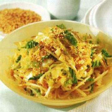 2.用中大火起油锅,拌炒洋葱3到4分钟,直到洋葱变软。加入大蒜、皱叶甘蓝和大白菜,炒大约5分钟,直到大白菜变得略软但爽口。加入豆芽、蚝油和芝麻,再煮2分钟。用适量黑胡椒调味,趁热上桌。
