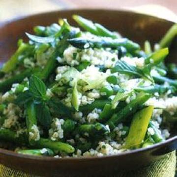 蒸谷麦(bulgur)11/4杯,橄榄油2汤匙,新鲜柠檬汁3汤匙,盐1茶匙,胡椒粉1/2茶匙,韭葱(leek)2根,纵向切半后切段(2.5厘米长),洗净,大蒜2瓣,切末,嫩芦笋12根,切段(5厘米长),冷冻豌豆(青豆)450克,切碎的新鲜薄荷叶25克