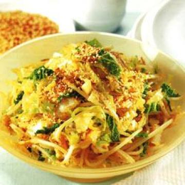 白芝麻30克,蔬菜油2汤匙,洋葱1个,切碎,大蒜2瓣,切碎,皱叶甘蓝菜(savoycabbage)1棵(300克),切碎,白菜(黄芽白)1/2棵,切碎,绿豆芽170克,蚝油4汤匙,盐和胡椒适量
