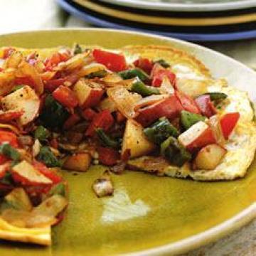 橄榄油1汤匙(约3茶匙),中等大小的洋葱1个,切块,大蒜2瓣,剁碎,小青甜椒1个,去籽后切块,西红柿1个,去籽后切块,烤红甜椒1个,去籽后切块,小马铃薯2个,煮熟后切丁(1.3厘米见方),盐1/2茶匙,大鸡蛋4个,略微打散