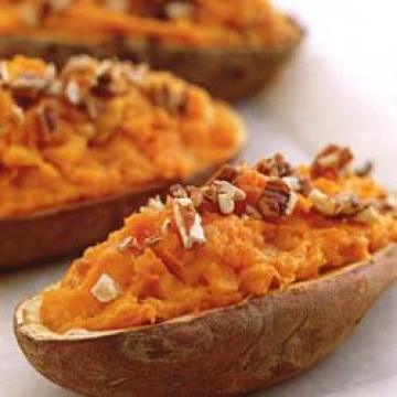 3.薯肉里加入菠萝、蔬菜油、奶油、糖、柳橙皮丝和盐,用打蛋器或电动搅拌器搅打至均匀,番薯泥稍稍蓬松。 番薯壳放在烤盘上,舀入拌合的番薯泥,至高高隆起。放回烤箱烤15分钟,撒上山核桃碎,续烤5分钟出炉。
