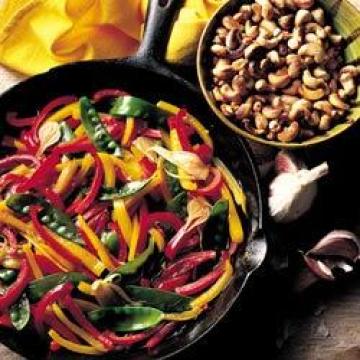 红甜椒2个,黄甜椒2个,糖荚豌豆115克,大葱8根,大蒜1—2瓣,清澈蜂蜜1汤匙,淡酱油2汤匙,麻油1汤匙,葵花籽油2汤匙,松子仁或无盐腰果25克