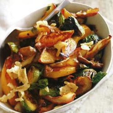 1.烤箱预热至205℃(400℉)。橄榄油和大蒜倒入大烤盘,加热3分钟,然后加入南瓜、球芽甘蓝、香菇、苹果、番茄干、迷迭香和盐,搅拌均匀。