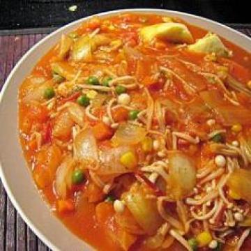主材:,玉子豆腐2条,蒜蓉1汤匙,中个洋葱1个,去皮切片,杂豆140克,金针菇200克,去尾段,蕃茄2个,切块,油、玉米粉适量,汁料:份量仅供参考,茄汁3汤匙,茄膏2汤匙,盐1茶匙,糖1茶匙,水5汤匙