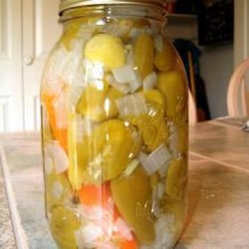 长黄椒500克,切成粗条,红椒或青椒500克,切成粗条,醋1.4升,水450毫升,蒜头3个,压碎,洋葱1个,切碎