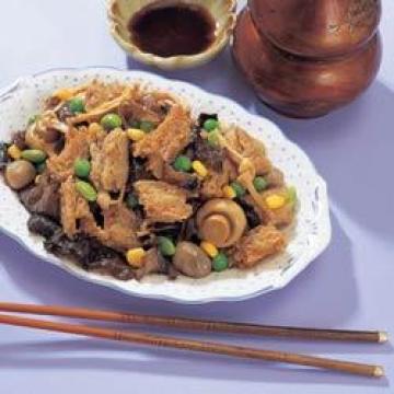 烤麸160克,毛豆子80克,胡萝卜80克,玉米80克,蘑菇80克,草菇80克,食油480毫升(另加2汤匙),姜汁酒1茶匙,素高汤480毫升,金针、云耳酌量,糖、盐各3/4茶匙,胡椒粉少许,麻油少许