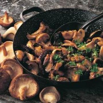荷兰芹1小束,干羊肚菌或牛肝蕈25克,黄油25克,橄榄油1汤匙,大蒜2瓣,中等大小洋葱1颗,瑞士褐蘑菇200克,鲜香菇200克,蚝菇150克,白兰地1—2汤匙,盐、黑胡椒适量