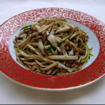 1.将鸡腿菇、凤尾菇、蟹肉菇、香菇和芦笋洗净,擦干水,切成细丝。大蒜切成两半。