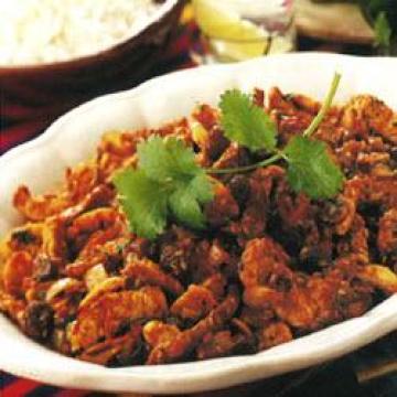 芥花油2茶匙,大洋葱2个,切丁,大蒜2大瓣,剁碎,红辣椒粉11/2汤匙,或按口味添加,芝麻1汤匙,小红辣椒1只,去籽,切碎,无骨无皮火鸡排454克,切成宽约2.5厘米的长条,盐1/2茶匙,西红柿(连西红柿汁)1罐(约390克),黑葡萄干140克,碾碎的丁香1/2茶匙,低脂、低钠鸡汤240毫升,苦味巧克力3汤匙,切碎,切片烤杏仁35克,切碎的新鲜香菜(芫荽)叶2汤匙