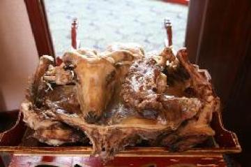 2、然后白水加盐煮熟,讲究火候(过了则老、不可食用),待煮好后,取出后,在大盘子中摆成羊的爬卧姿势,即可上席。
