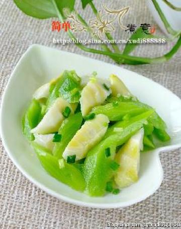 3.油入锅至4成热放葱花,香味出来立即关火.放入竹笋、莴苣笋、糖、鸡精拌匀即可.