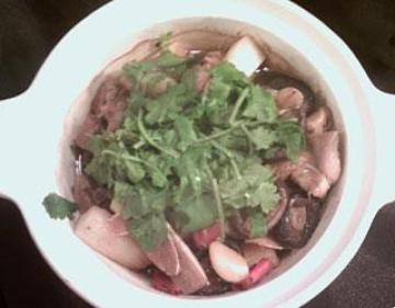 2.锅中烧热麻油,先炒香大蒜、姜片和辣椒,再放入鸡腿肉炒至表面略微焦黄,并一一加入黄酒、酱油、冰糖、花椒粉和白胡椒粉调味拌炒至鸡肉熟透并吸收汤汁后,放入香菇和山药,加入少许的水拌炒一下,再起锅盛入烧热的砂锅中焖煮烧至滚即可熄火,最后加入香菜盖上砂锅盖,淋上绍兴酒就完成了今天的这一道蒜子椒麻鸡了