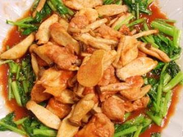3.锅中烧热1大匙油,放入姜片、杏鲍菇、鸿喜菇和猴头菇,加入红麴酱和糖调味烧煮至入味后,起锅前淋入麻油拌匀盛入摆有芥兰菜的盘子中即可完成