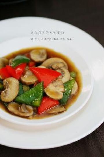 2 油热后下生姜,略微煸炒后下蘑菇和青红椒,加蚝油,盐,糖,生抽。