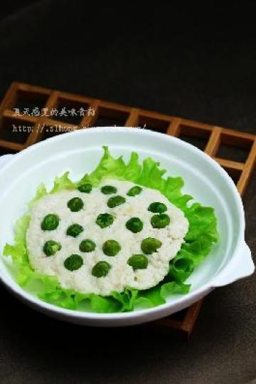 4. 在上面点缀青豆,隔水蒸8-10分钟。蒸好后抽出保鲜膜装盘。