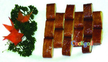 菜品选料普通,运用卷的方法制作,与传统熏制技法相结合,使菜肴在咸鲜口味的基础上增加了浓郁的茶熏香,油亮金黄的色泽美观诱人。