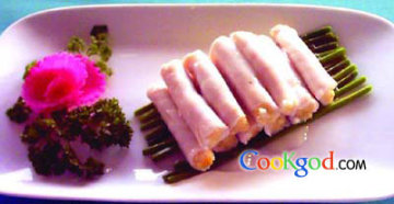 3、锅中加入剩下的色拉油烧至七成热,放入豆腐渣、鸡蛋、精盐、味精、白糖不停翻炒约1分半钟。然后将其搓成5厘米长、1.5厘米粗的长条,拍上面粉,放到牙片鱼肉片上卷起,在鱼肉接口处抹上湿淀粉,上笼屉旺火蒸4分钟取出,摆放在蒜苔上,然后浇上烧沸的清汤即可。
