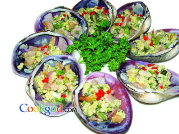 4、锅内放入花生油,烧至七成热时放入用鸡蛋调好的天鹅蛋肉和香椿末中火翻炒3分钟后出锅,装入天鹅蛋壳中,上面撒青红椒粒即可。