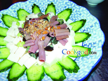 内脂豆腐1盒,海肠300克,松花蛋2个,黄瓜80克,炸香的腰果碎30克。调料自制酱汁100克。