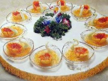 4、将制好的血燕、银耳装入造好型的“天鹅”内,装盘即成。