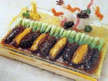 2、将酿制好的刺参入锅蒸熟后取出,用藏红花烧制即成。