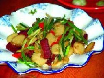 2、起锅烧油500克,将火腿轻滑油捞起,锅中留余油烧六成热,爆香马蹄、香芹、蒜苗,放火腿、盐、味精、胡椒粉、香油,大火翻炒15秒装盘即可。