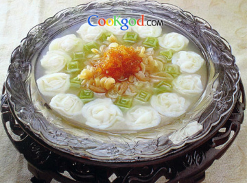 4、将预制好的原料配以清汤拼摆成形,即可上桌。