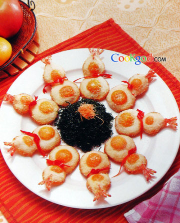 1、南豆腐、澳带、鸡肉、大虾制成泥,调味上劲备用。而包片修成葫芦形,咸蛋黄改成半球形。