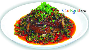 3、净锅上火,放入红油烧至七成热,放入姜末、蒜末煸香,入水发香菇粒、火腿末小火炒香,下老干妈辣酱、豆豉、郫县豆瓣、青杭椒段、小米椒小火翻炒1分钟,用盐、味精调味,淋香油,撒葱花,出锅浇在肘子上,跟荷叶饼上桌。