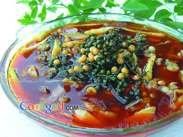 5、锅内放入混合油100克,烧至四成热时放入剩余的鲜花椒小火浸炸1分钟,出锅浇在牛蛙上。