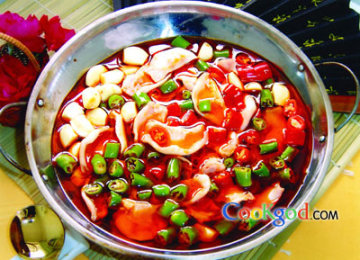 2、炒锅放入色拉油,烧至六成热时放入郫县豆瓣、干辣椒小火煸炒1分钟至香后加入高汤、切好的驼掌片、青红尖椒段、蒜块大火烧开后小火烧10分钟至熟,放入红油、盐、味精调味后起锅,装入盘内即成。