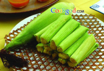 2、将搅好的玉米酱取出,加吉士粉、玉米粉、泡打粉、白糖、化猪油、精面粉、凉水50克搅拌均匀,捏成条,包入嫩玉米叶中,上笼大火蒸5分钟至熟,取出装盘即可。