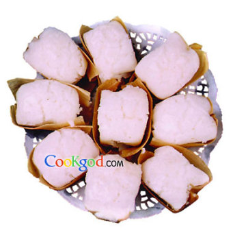 3、将拌匀的米浆放在盆里,表面盖上湿布,在20℃的温度中自然发酵2小时,用勺将其放入方形模具中,上笼大火蒸15分钟至熟,取出后将米团扣出,装入花纸中,入冰箱冷藏30分钟后上桌即可。