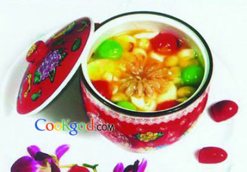 3、锅内放鸡油烧至6成热时加入牛鞭花大火翻炒1分钟,烹入料酒加入鲜汤(500克)、白果、鸡腿肉、火腿片、青笋圆、胡萝卜圆小火烧2分钟加2克精盐、3克味精调味,用水淀粉勾芡起锅即成。